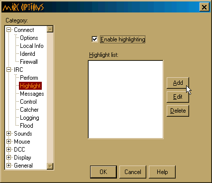 fig. 1 - Brugeren har bedt mIRC om at fremhæve sætningerNu skal du så have bestemt hvilke ord, mIRC skal reagere på - det gøres ved at trykke på Add